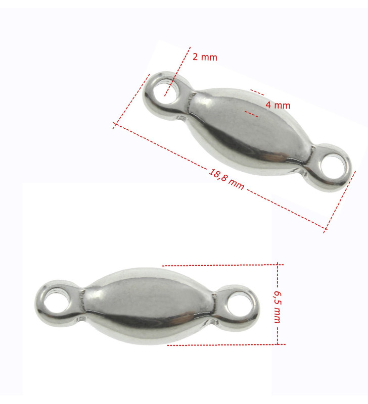 Konektor z nerezové oceli třídy 304, ve tvaru oválu, v originální i zlaté barvě, povlakované kvalitní vakuovou metodou v České republice. Bližší informace ohledně PVD povlakování naleznete na našem blogu nebo nápovědě FAQ.