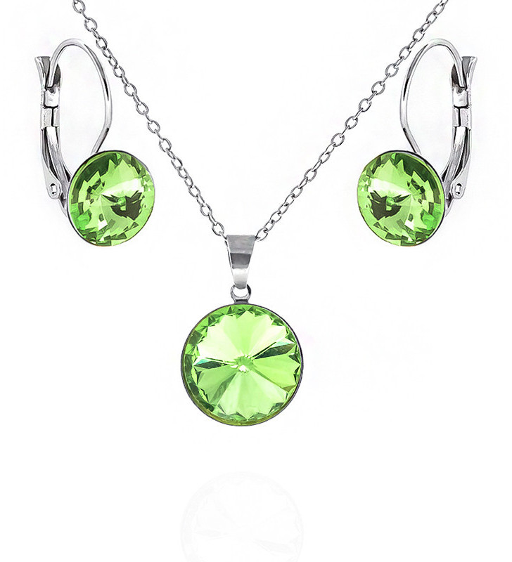 Set šperků z inspirativní kolekce JJSTYLE® vyrobené z nerezových komponentů dostupných na eshopu, viz související produkty. Vysoce kvalitní česká ruční výroba. Náušnice jsou z leštěné nerezové oceli 316 o celkové délce cca 22mm a lůžkem cca 10mm. Přívesek o průměru krystalu 12mm a celkové délce cca 18 mm. Dodáváno s 1mm řetízkem o délce 45cm. Celý set je doplněn Zelenými krystaly 10 a 12mm.