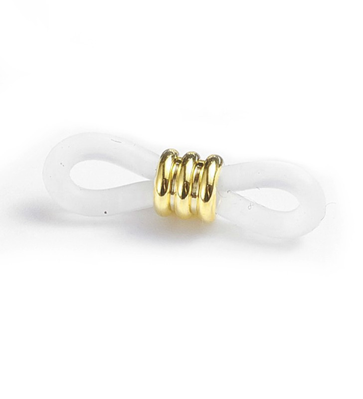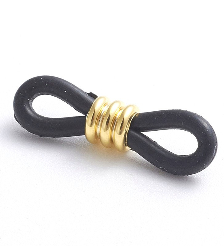 Gumová Koncovka - Držák na brýle, v kombinaci s nerezovou ocelí s povrchovou úpravou zlaté barvy, o délce 20mm a síle gumičky 1,8mm. Nerezový korálek o rozměru 4,5x4,5mm, s průvlekem 3mm. Cena uvedena za 1Ks.