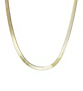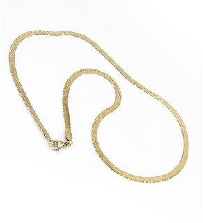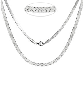 Flat snake chains 3x0.5mm with carabiner and welded rings and ends. The length is listed for the chain, but the total length with the clasp is +-2cm longer.
